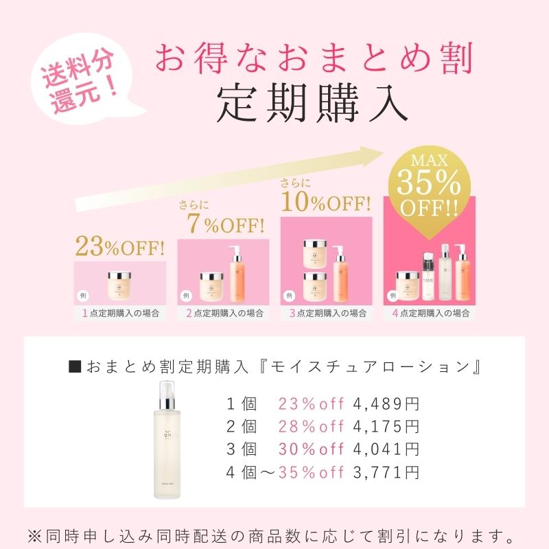 ■おまとめ割定期購入『モイスチュアローション』 1個 23%off 4,489円 2個 28%off 4,175円 3個 30%off 4,041円 4個~35%off 3,771円 ※同時申し込み同時配送の商品数に応じて割引になります。 ※同じ商品でも他の商品組み合わせでもOK!詳しくはこちら |