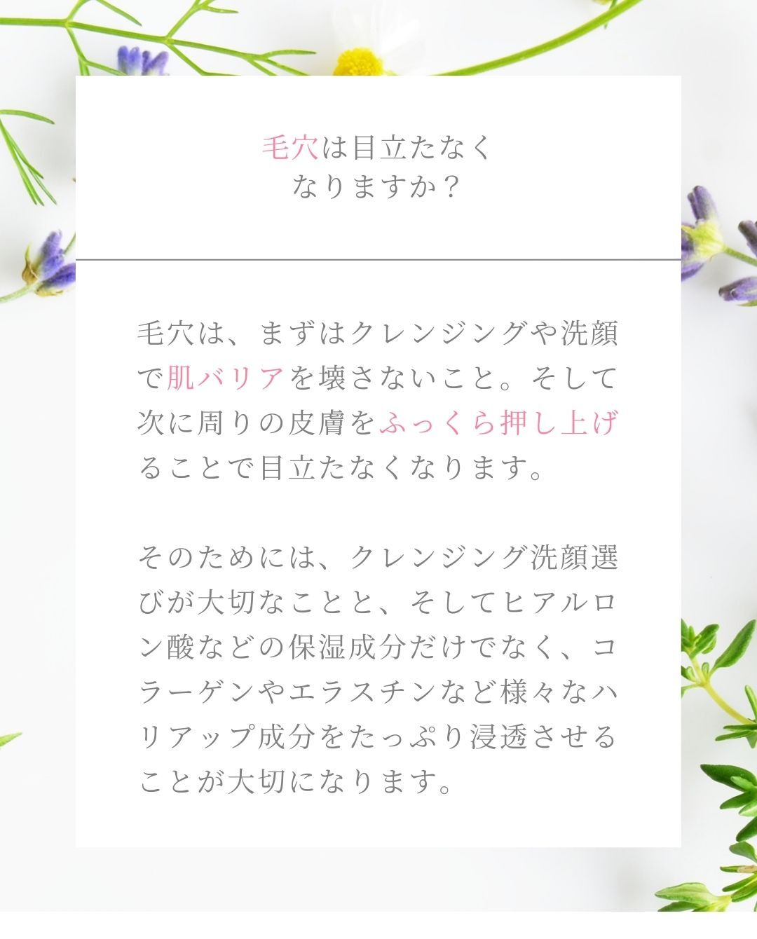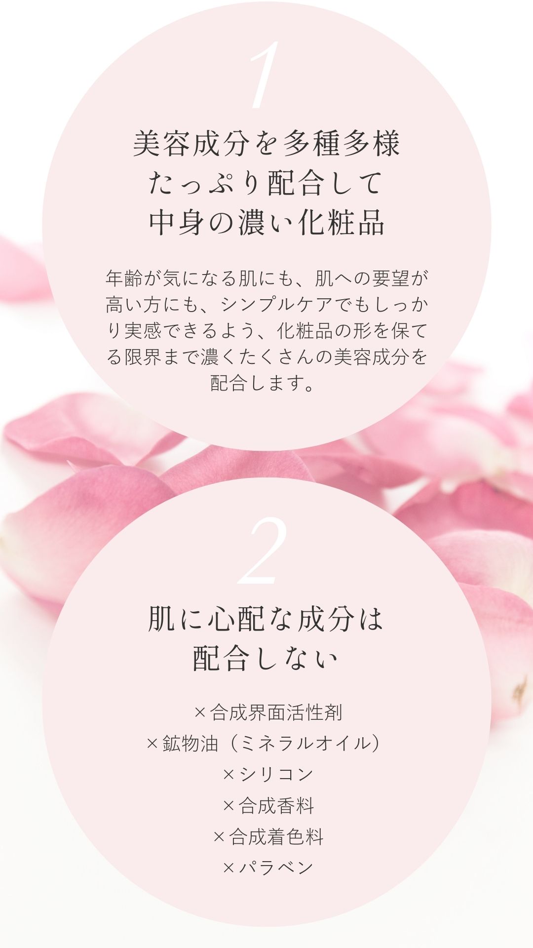 水、グリセリン、スクワラン、ペンチレングリコール、ダマスクバラ花水、ラベンダー花水、BG、ホホバ種子油、ヒアルロン酸Na、加水分解ヒアルロン酸、加水分解コラーゲン、サクシノイルアテロコラーゲン、水溶性プロテオグリカン、メロン胎座エキス、アセチルチロシン、カンゾウ根エキス、クロレラエキス、アロエベラ葉エキス、クズ根エキス、リン酸アスコルビルMg、セイヨウシロヤナギ樹皮エキス、ボタンエキス、ヒメフウロエキス、パルミチン酸、カニナバラ果実エキス、フランスカイガンショウ樹皮エキス、トレハロース、トコトリエノール、ジパルミトイルグリセロホスホコリン、ジセチルジペプチド-9、セイヨウオオバコ種子エキス、アラントイン、ホルモイルグルタミン酸ジステアリルPEG-18、リン酸2Na、コレステロール、ローヤルゼリーエキス、ラベンダー花エキス、リン酸Na、ビルベリー葉エキス、α-グルカンオリゴサッカリド、水溶性コラーゲン、ベタイン、PCA-Na、ソルビトール、セリン、グリシン、グルタミン酸、アラニン、リシン、アルギニン、トレオニン、プロリン、ユズ果実エキス、ローマカミツレ花エキス、トウキンセンカ花エキス、ヤグルマギク花エキス、カミツレ花エキス、セイヨウオトギリソウ花/葉/茎エキス、フユボダイジュ花エキス、黒砂糖エキス、オウゴン根エキス、加水分解エラスチン、クダモノトケイソウ果実エキス、トコフェロール、アミノカプロン酸、グリチルリチン酸2K、ヨモギ葉エキス、シア脂、ラベンダー油、ティーツリー葉油、カルボマー、水酸化K、フェノキシエタノール